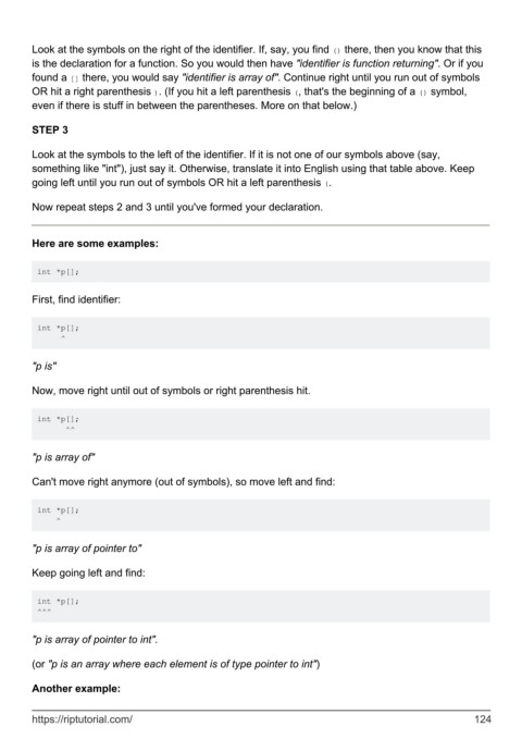 found a [] there, you would say "identifier is array of". Continue right until you run out of symbols