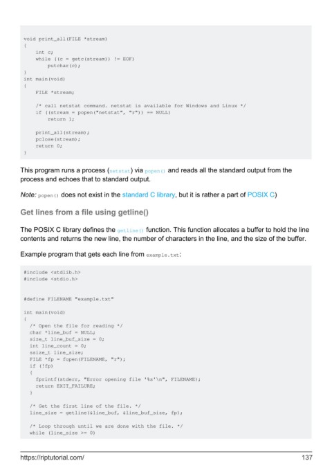 This program runs a process (netstat) via popen() and reads all the standard output from the