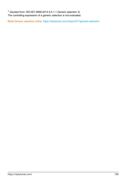 1 (Quoted from: ISO:IEC 9899:201X 6.5.1.1 Generic selection 3) The controlling expression of a generic selection is not evaluated. Read Generic selection online: https://riptutorial.com/c/topic/571/generic-selection https://riptutorial.com/ 166