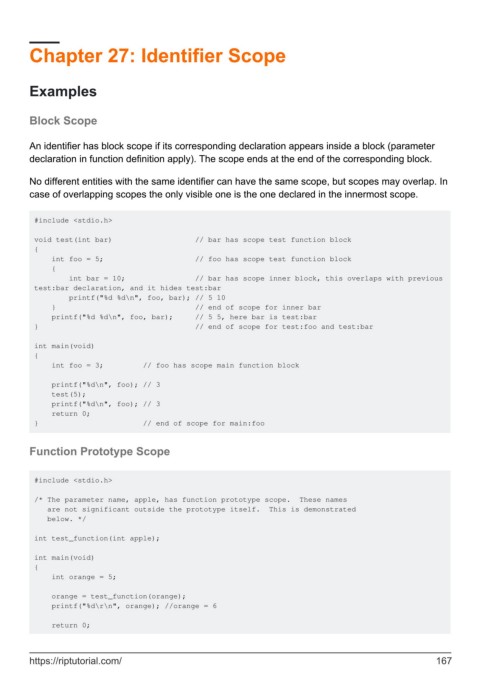 An identifier has block scope if its corresponding declaration appears inside a block (parameter