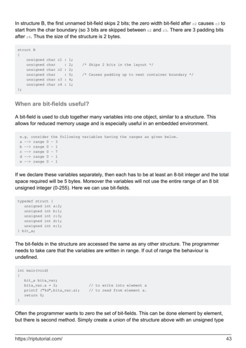In structure B, the first unnamed bit-field skips 2 bits; the zero width bit-field after c2 causes c3 to